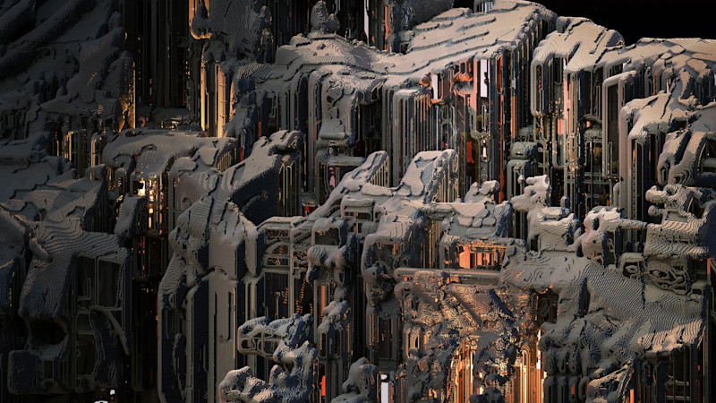 Comprised by an underlying series of voxels, materials are allocated to a building's skin through a system of colour coding based on variables such as opacity, strength, directionality and curvature. Each building on the site has binary conditions: a colour-coded, voxelised, virtual existence, and a material reality which combines stone, marble, glass and vegetation.