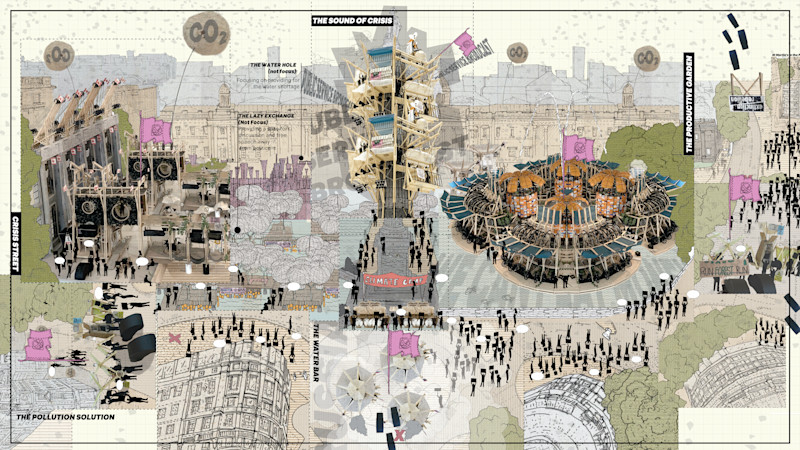 Climate change will affect humanity on an unprecedented scale. Widespread government inaction has forced the rise of the eco warriors, who have pitched themselves on the front line of the fight to force change. This project takes a cynical stance, one which accepts the slow and inadequate approach by the UK government and the unfortunate climatic conclusions that will result. It learns lessons from the often precarious actions of climate activist groups. The project proposes a politically powerful built extravaganza erected in anticipation of catastrophe in London’s political theatre, Trafalgar Square.