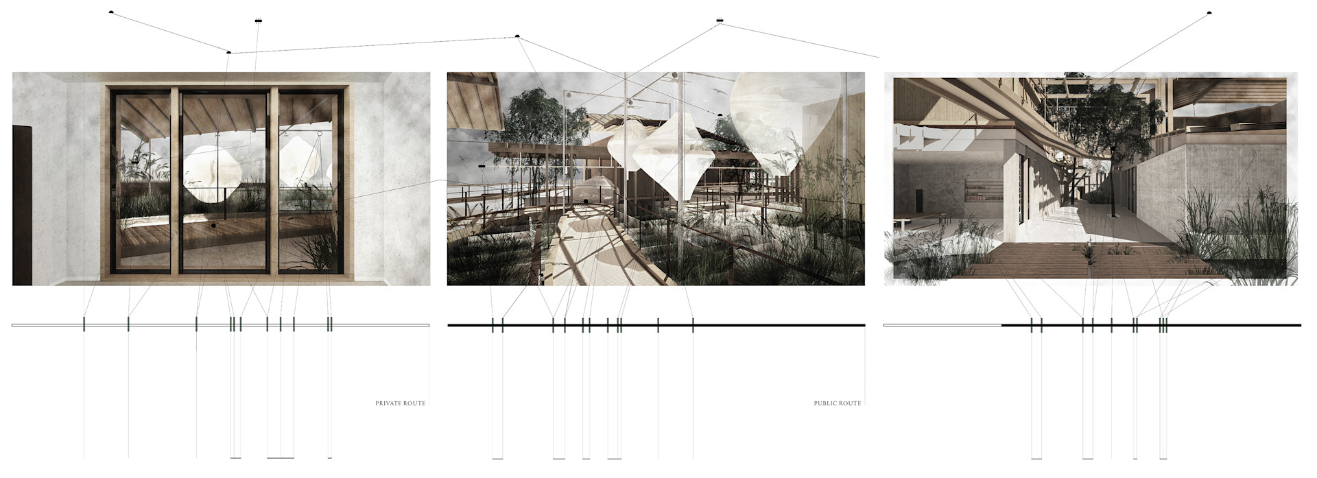 This compiled drawing demonstrates the acoustic considerations taken from three key moments, together showing a journey through the proposal.