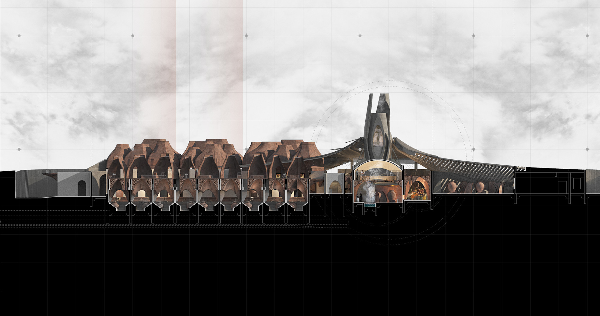 Georgian culture is already heavily centred around the notion of celebrating everything from small everyday pleasures to important occasions. The supra (feast) presents the common format for these celebrations and follows a traditional ritual process led by the tamada, the toast master, aided by the merikife, the wine runner. In stretching the concept of the supra over a year-long period, the building is structured to accommodate three key celebratory rituals along the annual cycle of its wine and ceramics production. Each represents a toast dictated by an interactive architectural embodiment of the tamada and the merikife.