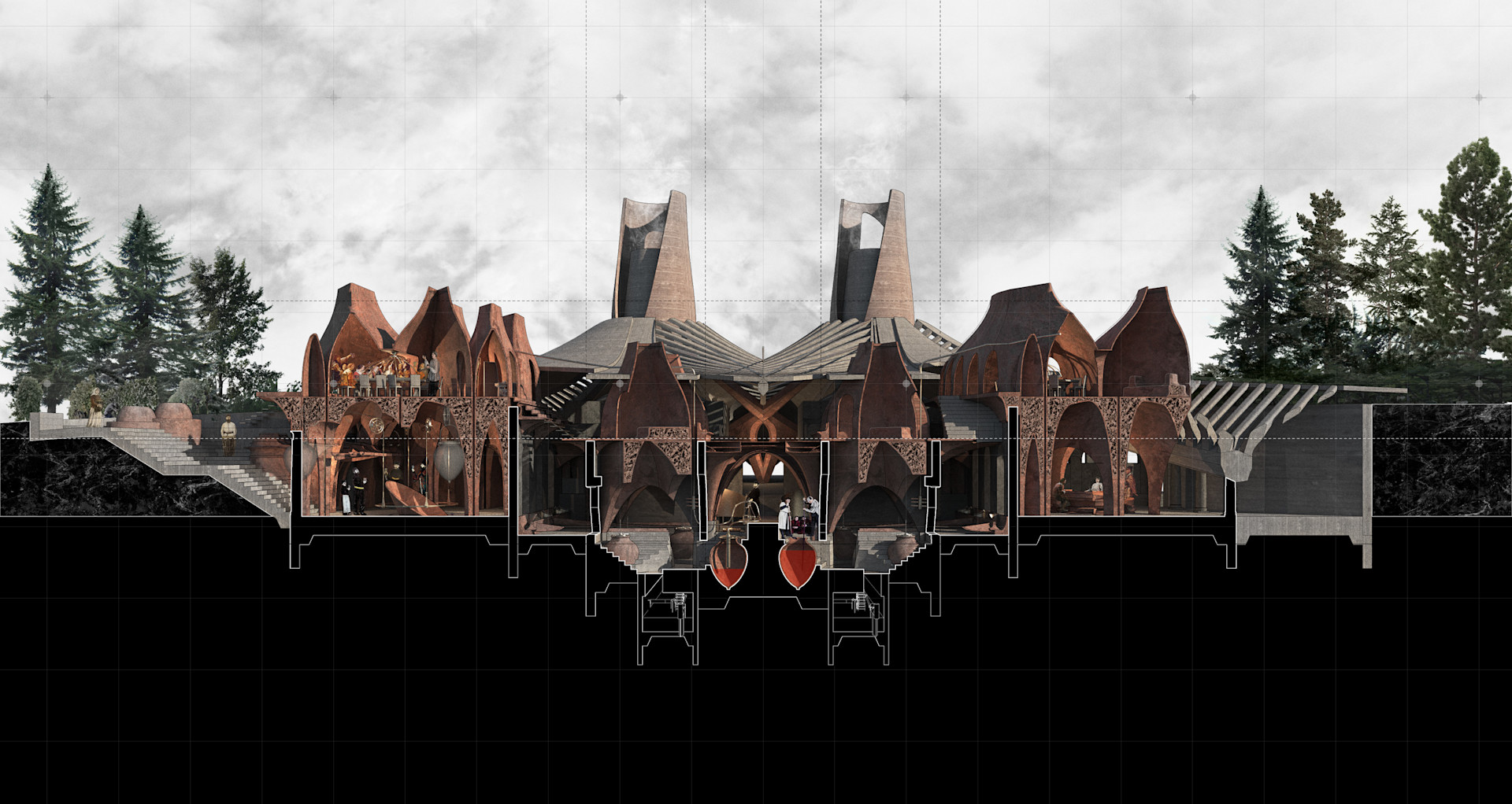 This design project focuses on mediating two distinct yet interrelated processes: the production of wine and the fabrication of traditional Georgian wine fermentation vessels, qvevri. In order to establish an architectural identity for the town to move on from its lingering Stalinist past, the sanatorium site, which was initially built for collective institutionalised recreation, is reconfigured to host a program of collective cooperative production. The proposed winery achieves this by absorbing the existing ruins through a new typology informed by participatory production processes and ritualistic celebration.