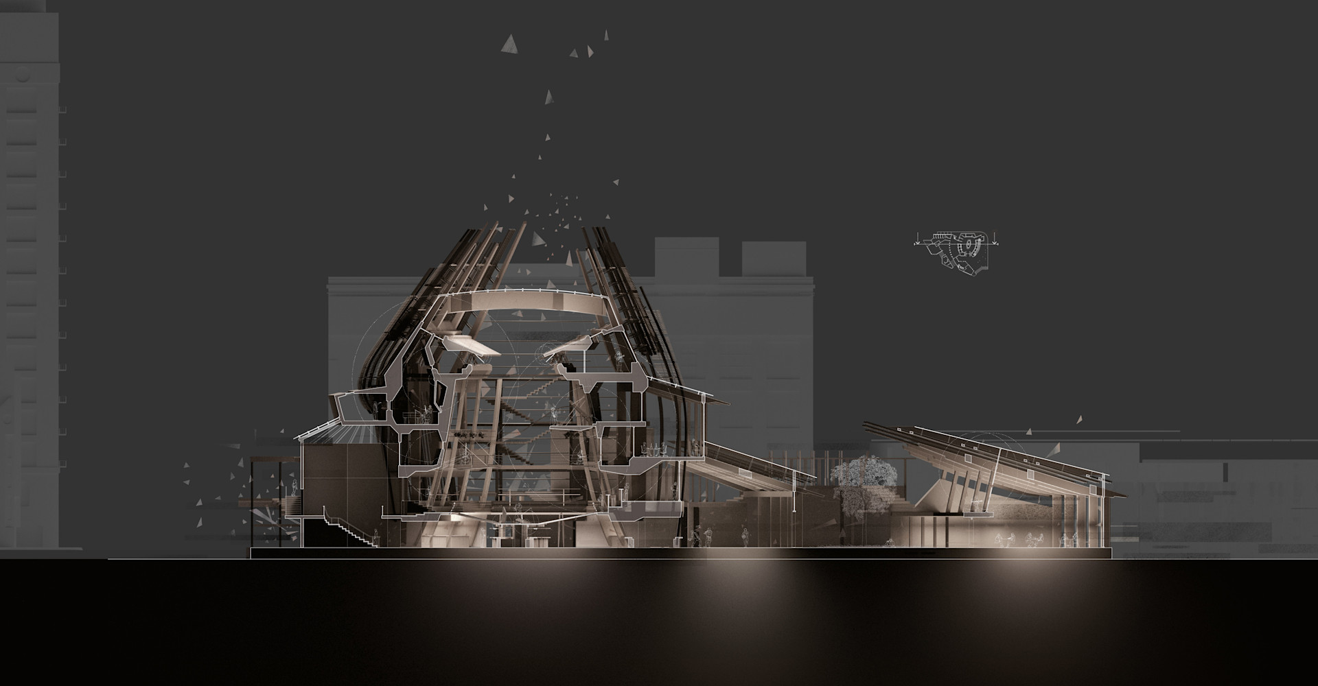 The project is a food market for downtown Chicago that integrates adaptive performances and recording spaces for jazz musicians, looking to revive a street culture lost through the sprawling of the city. By the tinkering of a kinetic architecture, the market transforms daily into an immersive music hall.